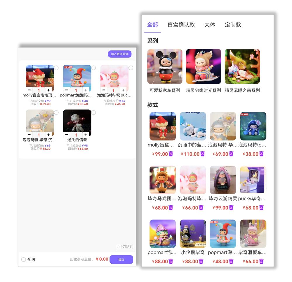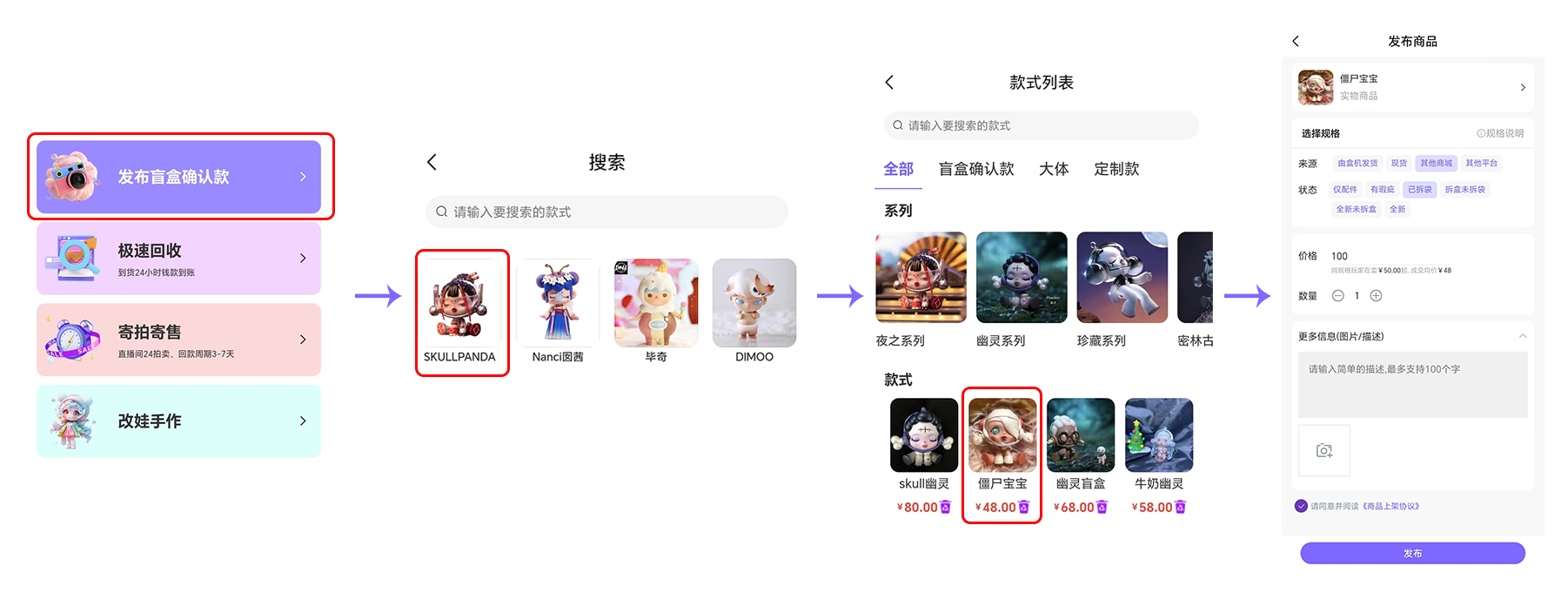 点击发布盲盒确认款→选择要发布的IP→选择要发布的款式商品→填写规格、价格、图片描述等→即可发布成功,可编辑管理上下架并分享